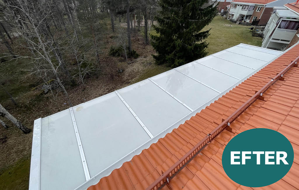 Takbytet har utförts av vår entreprenör BITAB och är en viktig del av det långsiktiga underhållet av fastigheterna. Nu under våren har även skärmtaken på balkongerna rengjorts, ett arbete som genomförts av Specialrengöringar Sverige.